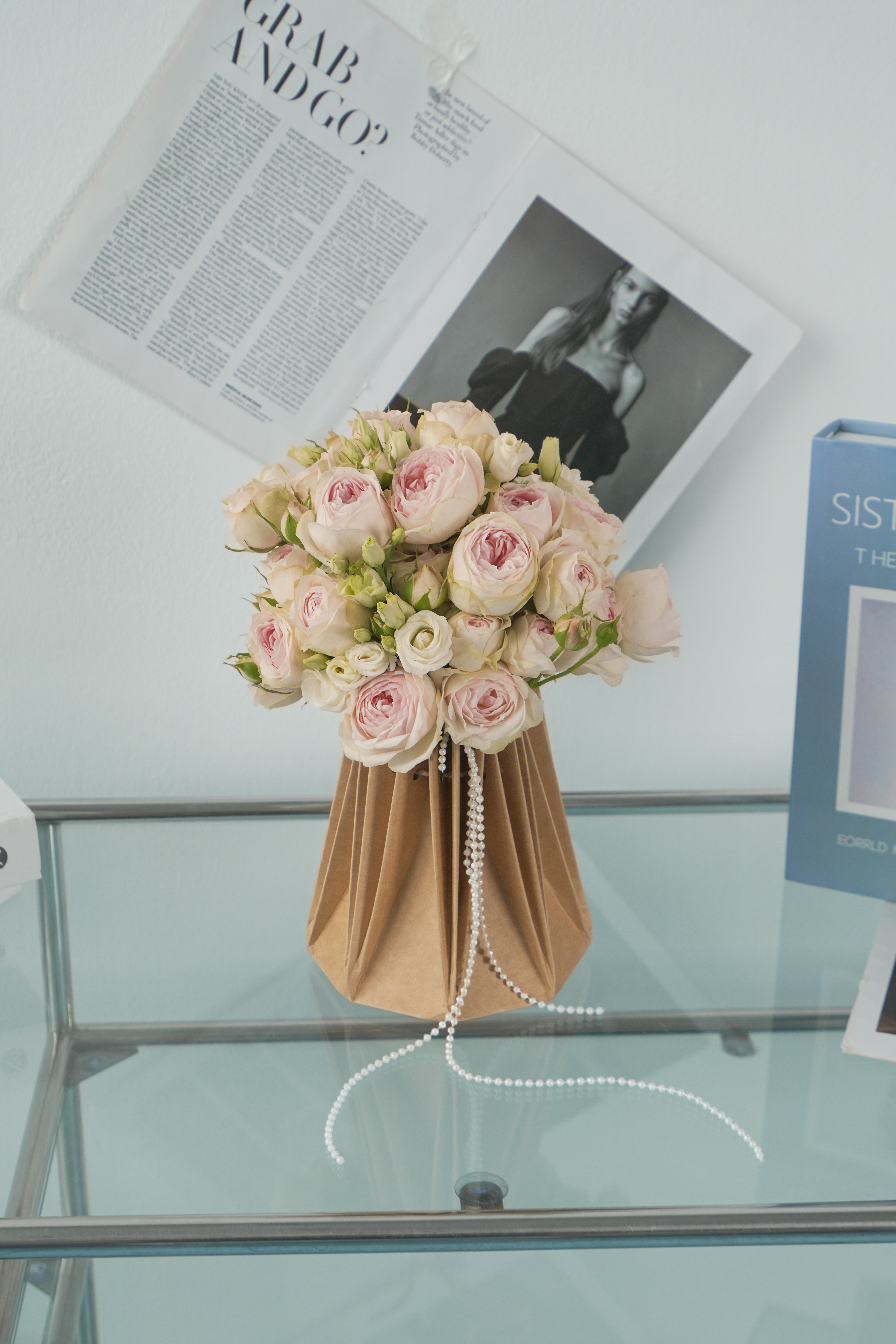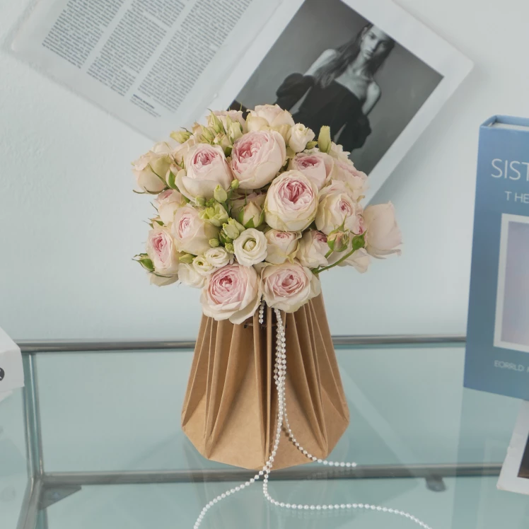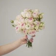 Пионовидная роза задаёт объём и мягкость. Её бархатистые бутоны рассыпаны по веткам — это живая, садовая фактура, которая делает букет естественным и тёплым. Гладкая эустома добавляет стройности и чистоты: плотные, аккуратные бутоны собирают внимание и не дают композиции растекаться.