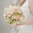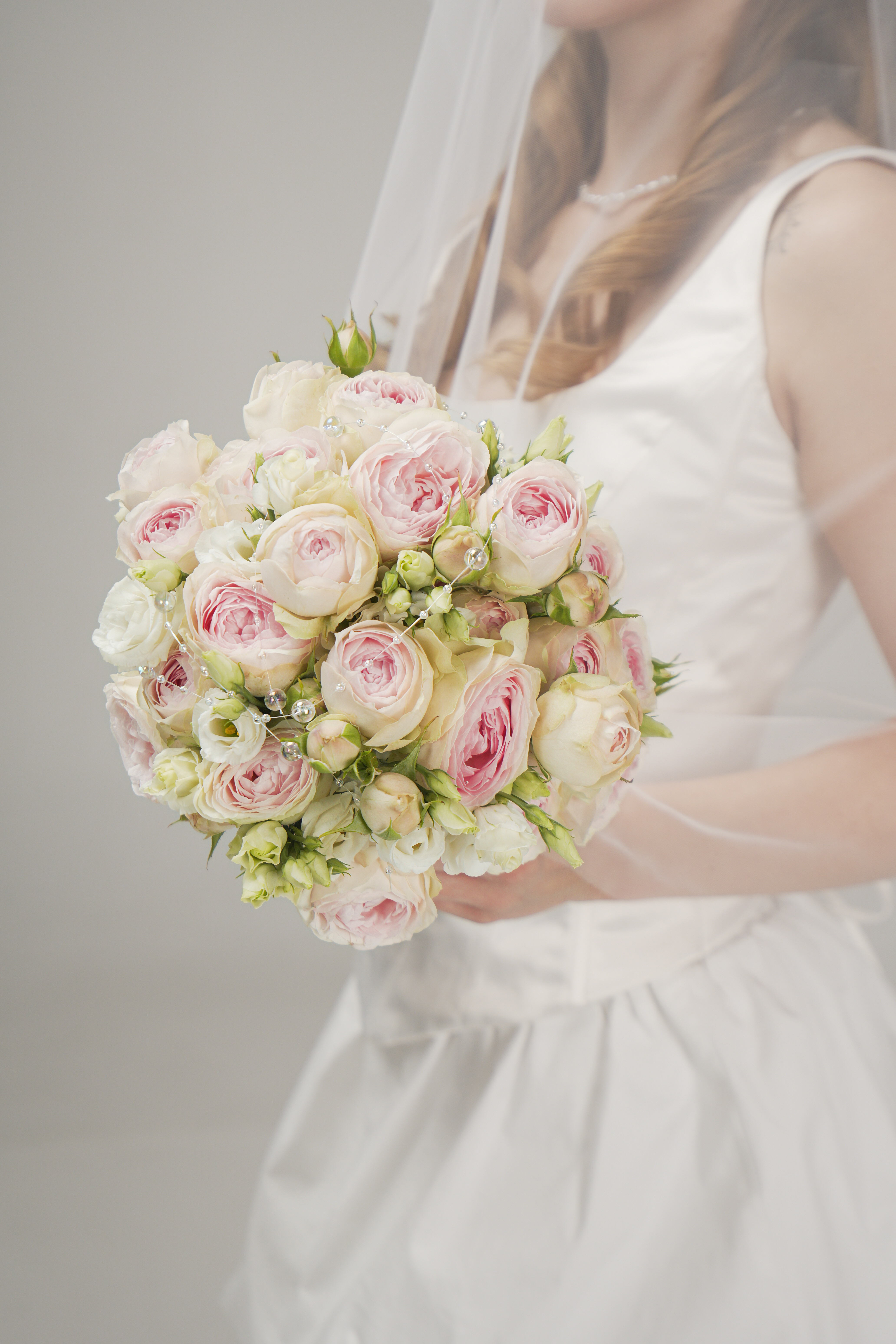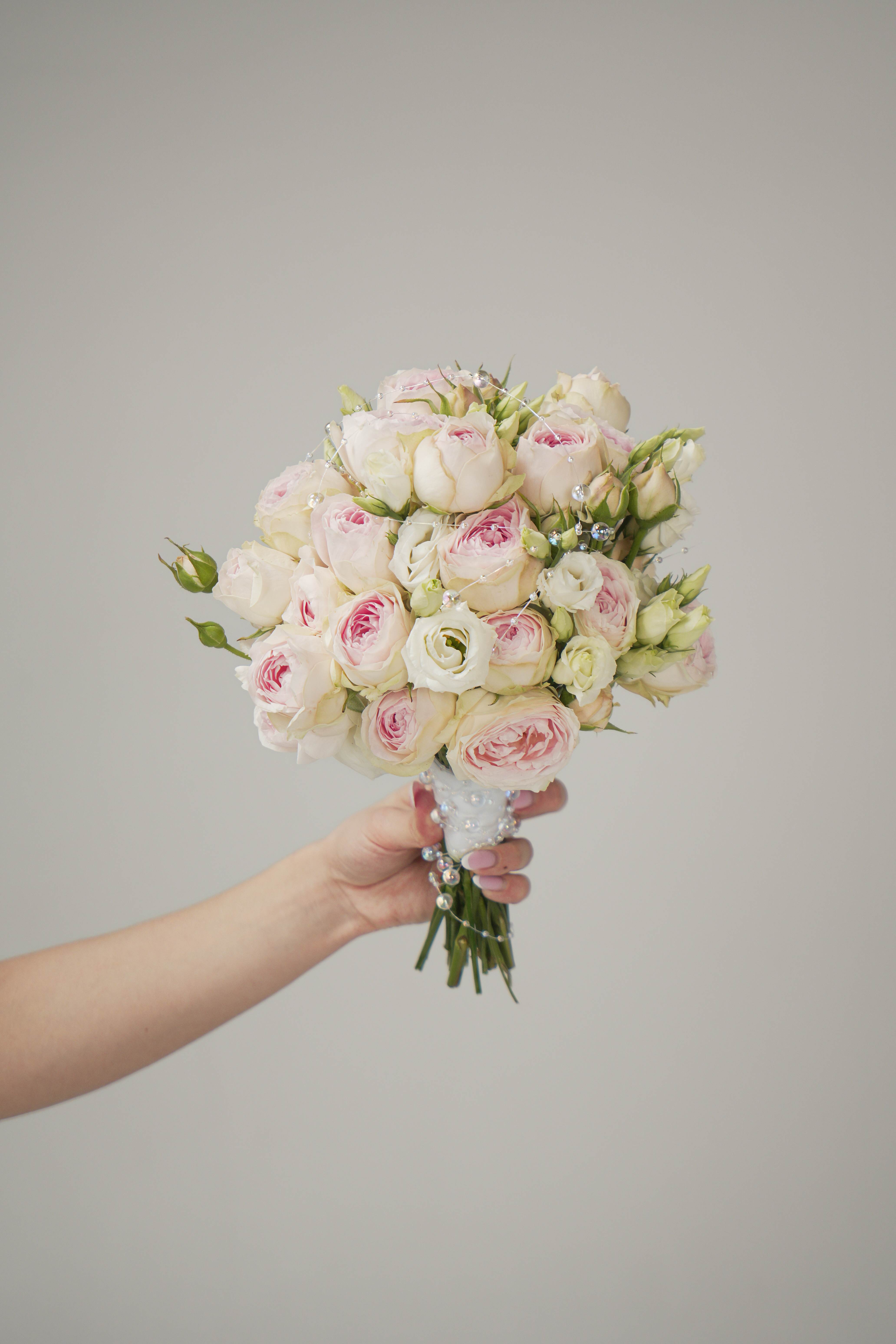 Кустовая пионовидная роза, гладкая эустома и бусы — свадебный букет, где продумана каждая деталь.